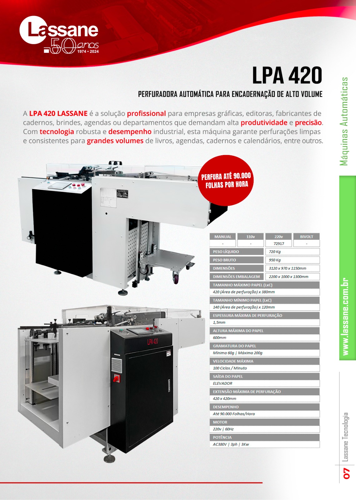 A LPA 420 Lassane é a solução profissional para empresas gráficas, editoras, fabricantes de cadernos, brindes, agendas ou departamentos que demandam alta produtividade e precisão. Com tecnologia robusta e desempenho industrial, esta máquina garante perfurações limpas e consistentes para grandes volumes de livros, agendas, cadernos e calendários, entre outros. Perfura até 90.000 folhas/hora.